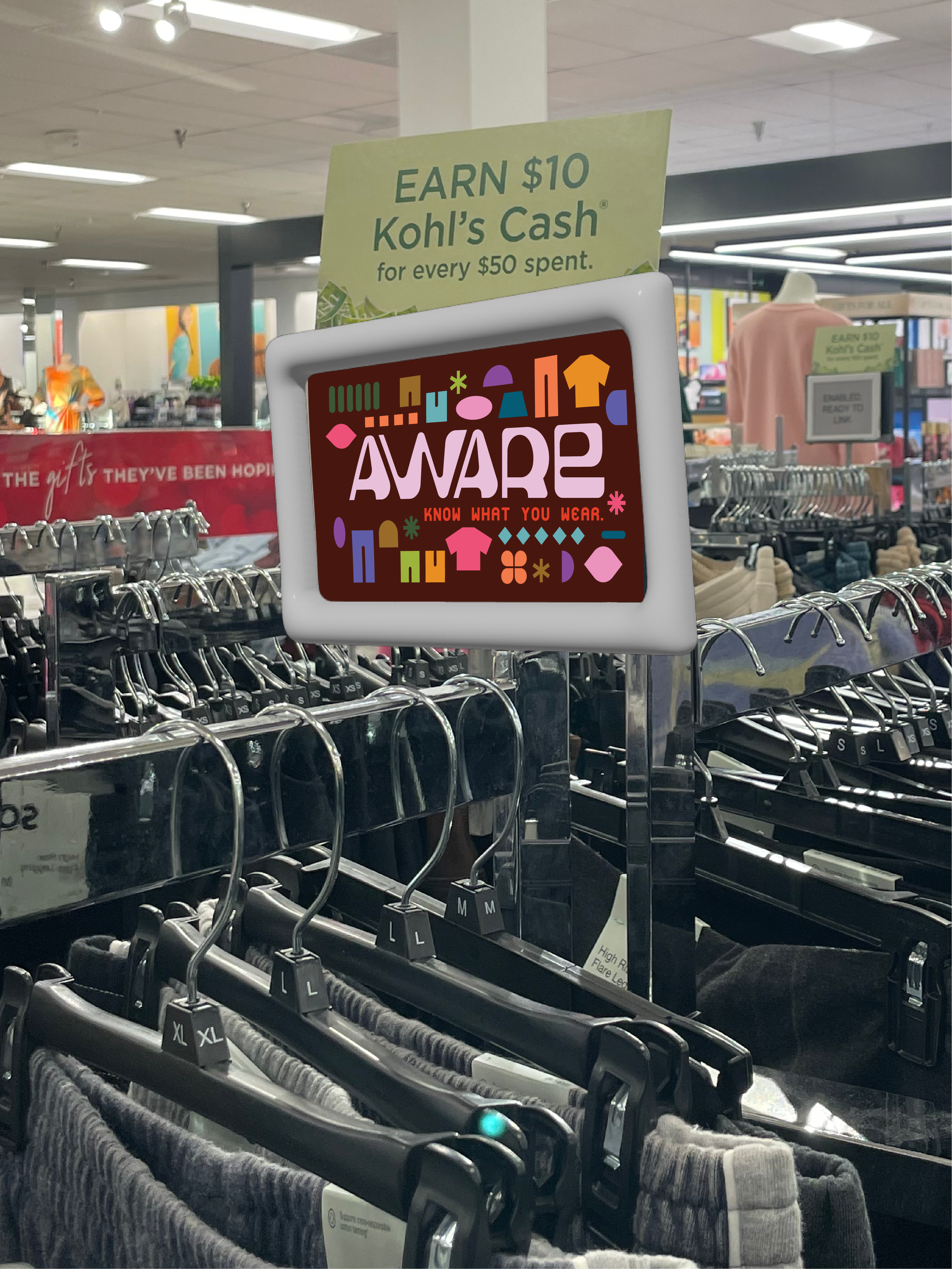 AWARE is a speculative solution to fast fashion that eliminates the tedious struggle of searching for products’ ethical and environmental information by bringing transparency to supply-chain movement. It strives to create a fun and easily digestible pathway of information that is accessible to even a non-conscious consumer. Currently, it encompasses a database that collects and rates information from products’ supply chains that are shared with the consumer via an in-store tablet and app, allowing the users to make real-time decisions about their buying habits.