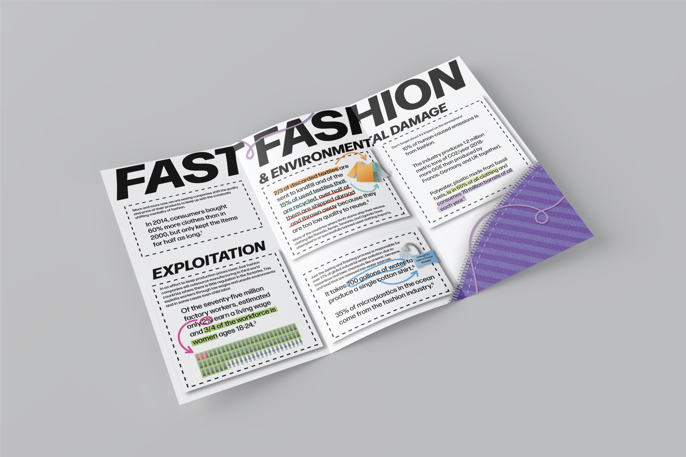 The bright, vibrant colors featured on the topmost layer of the posters mirror the fast fashion industry’s enticing advertising that appeal to consumers. On top of these areas, are misconceptions that the industry uses to paint themselves in a positive light, like eco-friendly programs, bargains and affordable products, and trendy fabrics. The top layer is unzipped to reveal a more sinister layer underneath showing the negative circumstance that creates or contradicts the positive branding. Throughout the branding materials, there are motifs of threads and stitching that further compliment the zipper and tactile details.
