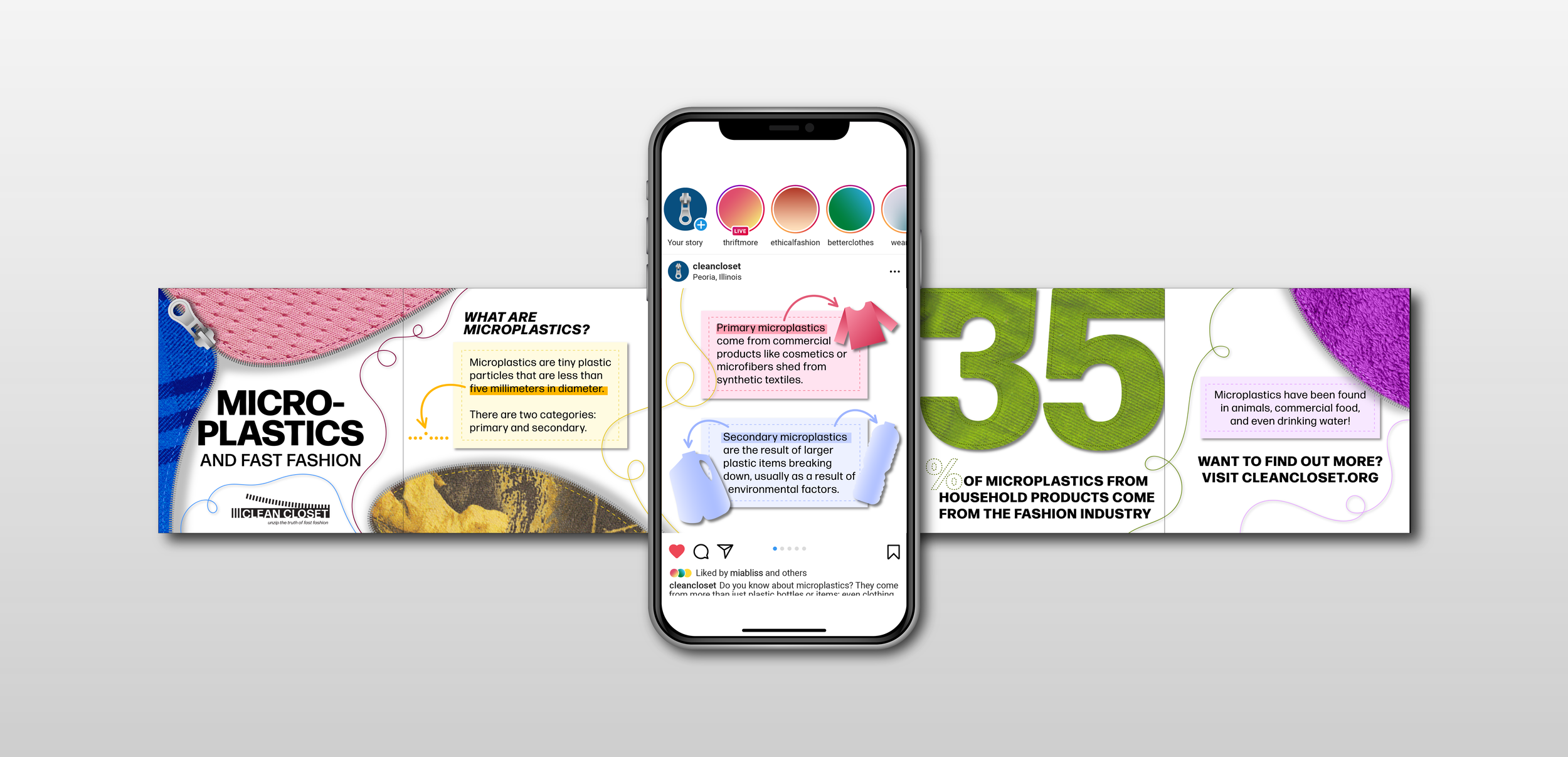 Clean Closet is a research-based branding project that encourages global competence (understanding about and action on global issues) through informational design. While fast fashion is a well-known term, its detrimental impacts are often concealed or skewed, making it easily overlooked by the consumer. This campaign plays on the physical enactment of the idiom “my lips are sealed” where the mouth becomes a zipper that is being closed. The zipper is an accessory of clothing that is found on many garments, making the idea of zipping and unzipping universally understandable. Using the zipper as inspiration, Clean Closet works to “unzip the truth of fast fashion” and share the negative impacts of fast fashion that are hidden behind the clothing industry’s glamorous facade.